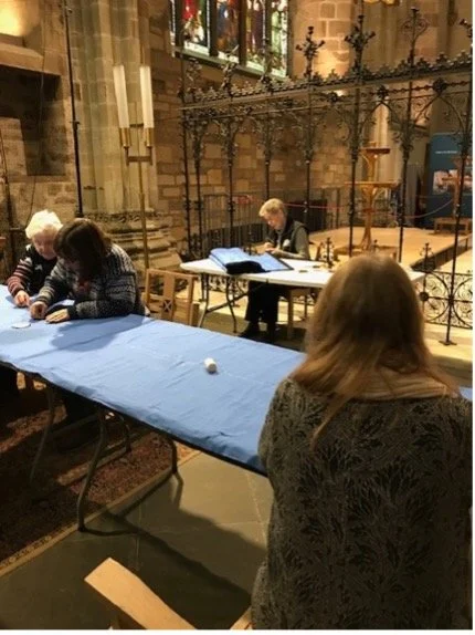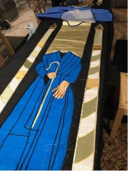 All of this took 2 years. In March 2024 work started in earnest on the other three. The Banner Guild had swelled to a dozen, quilting, sewing, embroidery experts, many of them members of the Costume Society who were ready to get working and offer their skills for the benefit of the church. In the Holy Cross Aisle, each week from March to July, the team cut, ironed, tacked, pinned and sewed the banners.