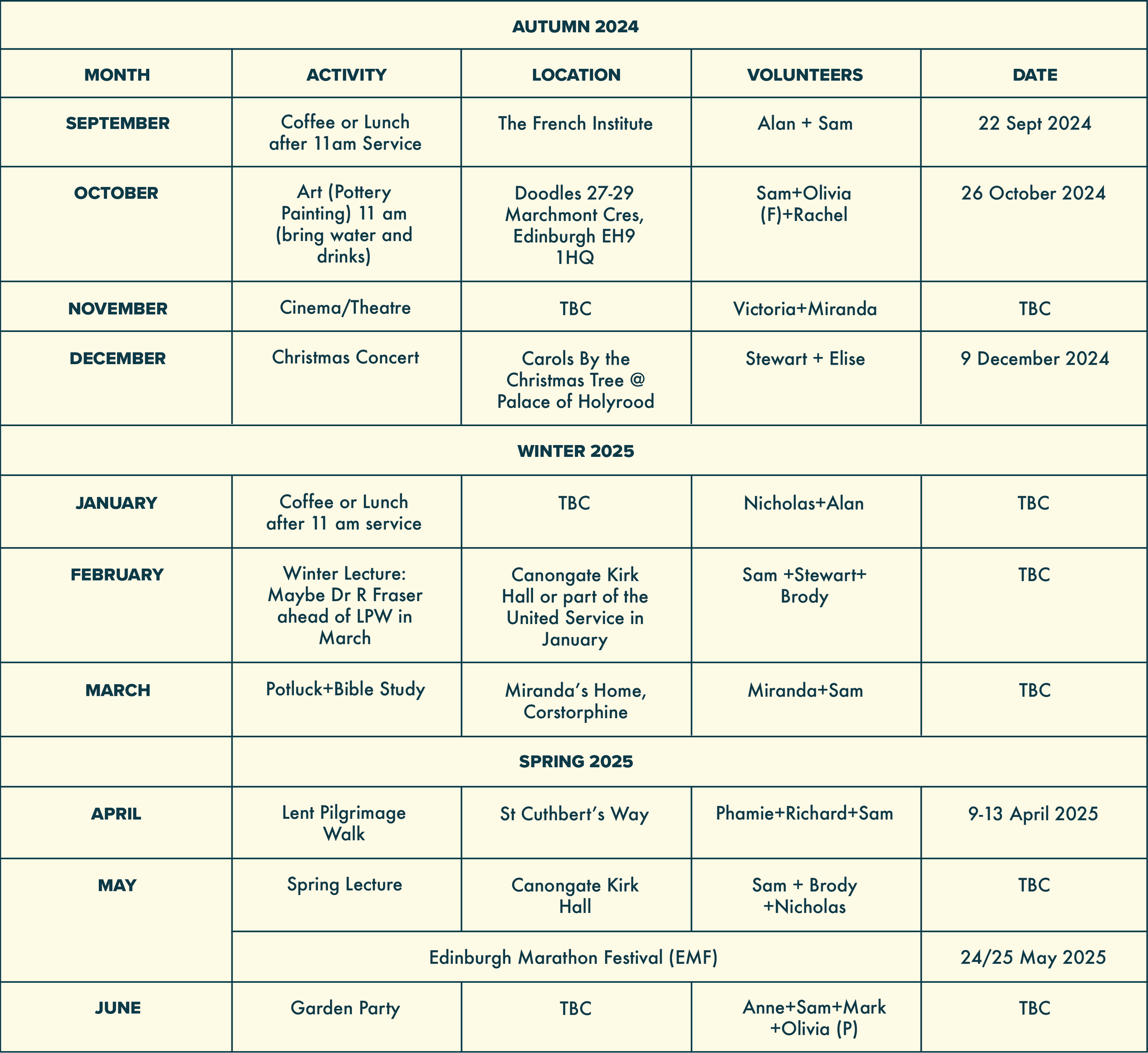 We are young adult members of St Giles’ Cathedral and Canongate Kirk. We meet once a month to foster connection, friendship, and trust through a variety of activities.